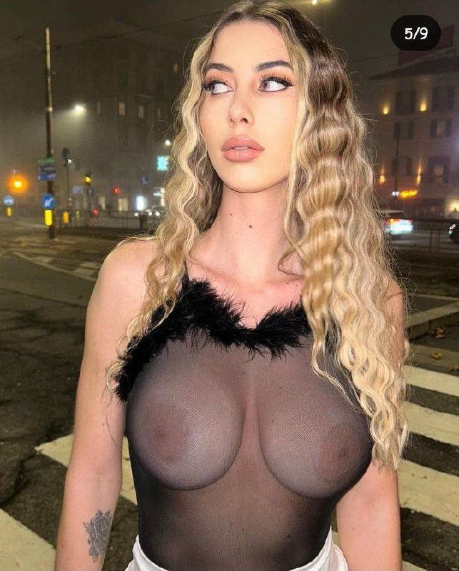 Милая красотка позирует в прозрачной майке на улице